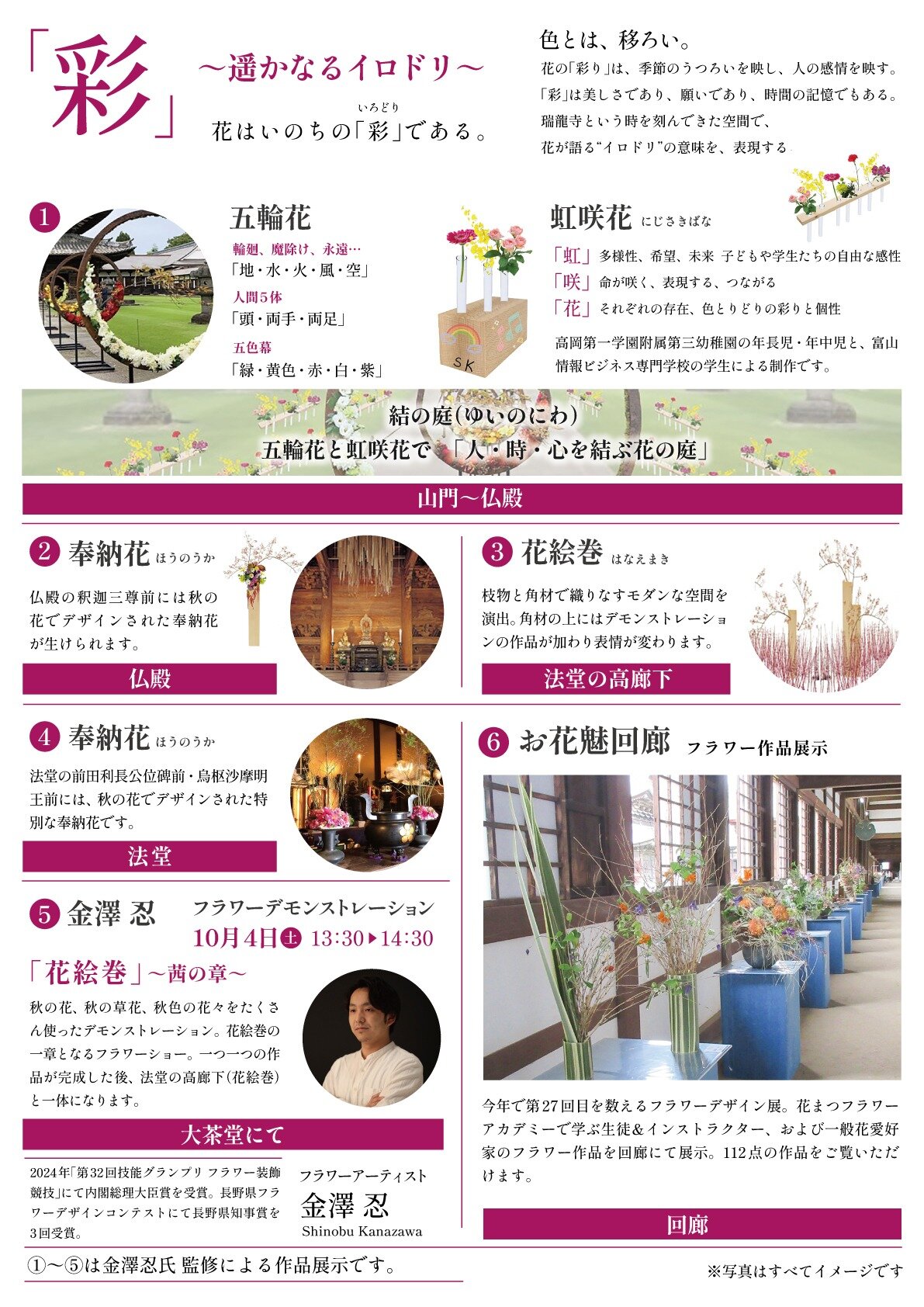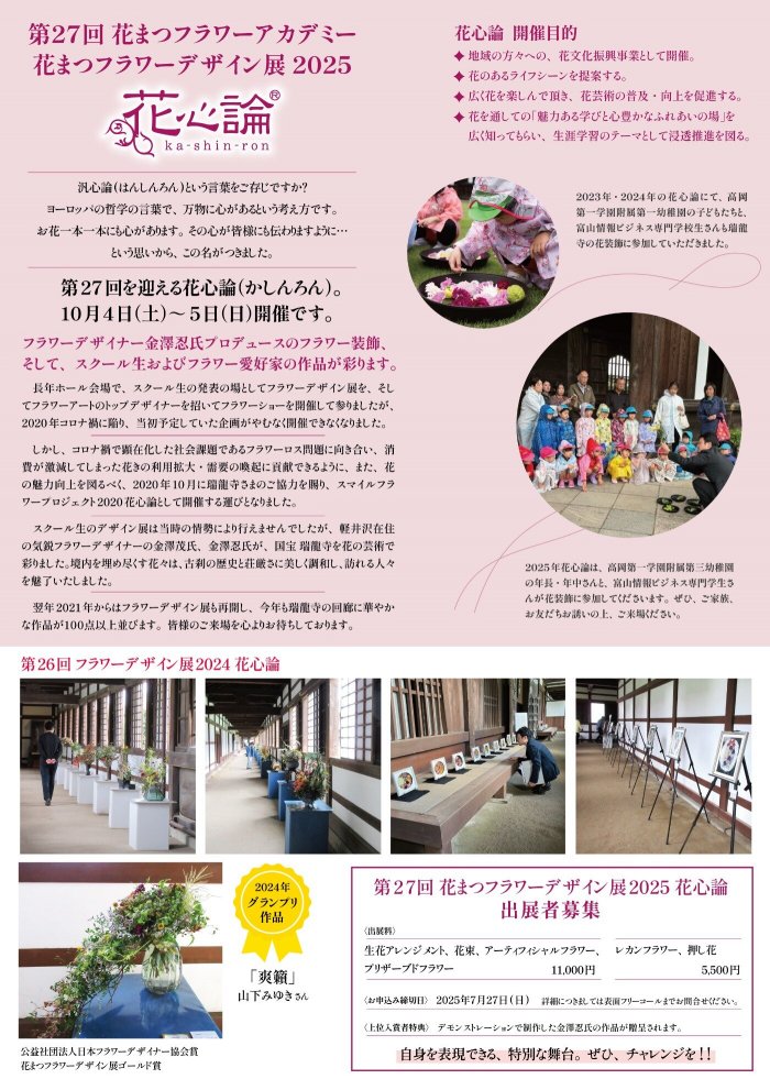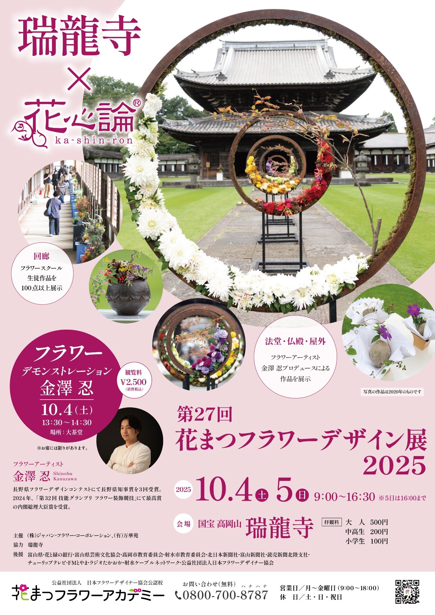 2025年10月4日~5日に、国宝 瑞龍寺にて「花心論 2025~花まつフラワーデザイン展」を開催いたします。
